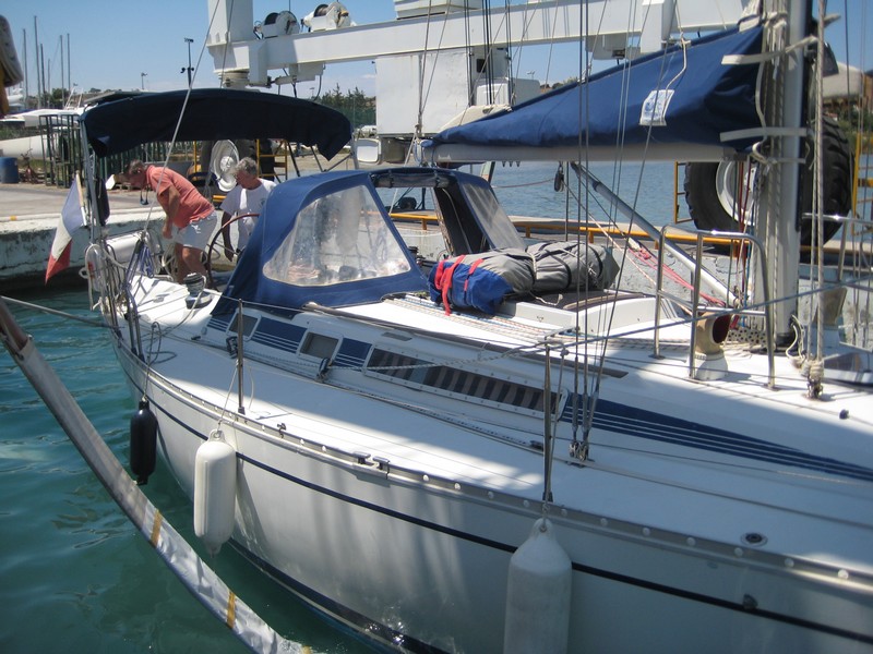 J'ai donc pris l'avion le 5 mai pour rejoindre Kilada en Grèce où était hiverné le bateau et où il a passé quasiment toute sa "carrière", y compris avec le premier propriétaire stationné en Turquie. Pour la petite histoire Kristal aura eu en tout 4 propriétaires. Le premier était le patron de chez Bénéteau de l'époque qui s'en était "servi" comme bateau de démonstration. Autant dire que déjà l'équipement était conséquent. Une vitrine ! Il s'appelait alors Quo Vadis. Puis il est passé dans les mains d'un deuxième qui l'a gardé pratiquement 20 ans. Eh oui !! Kristal a 30 ans cette année (en décembre). Le deuxième propriétaire méticuleux et surtout fan d'équipements et de matériels divers l'a quasiment équipé pour en faire une bête de régate et, par ailleurs en a fait quelques unes avec le bateau qui a pris le nom qu'il a eu jusqu'à ce que je le change : Kotaya II. Pourquoi avoir changé le nom ? Pour me l'approprier bien évidemment et surtout parce que tant que je ne savais pas à quoi le nom correspondait, je le trouvais sympa, jusqu'à que l'ex-proprio me le traduise et là........ En fait Kotaya est un mot d'une langue africaine qui veut dire "gros ventre", mais d'une femme enceinte. Évidemment ça ne correspond en rien à mon histoire, donc changement !