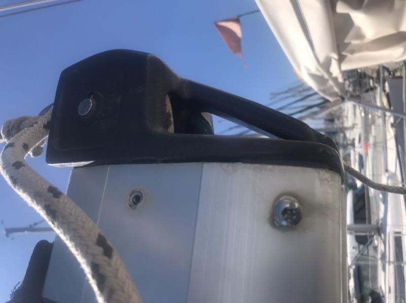 Sortir le nez de bôme. Ce n’est nécessaire de le démonter pour changer la bosse qui baisse la chute de GV mais il faudra le faire pour changer le bout qui affale le guindant et surtout ça permet un nettoyage des poulies intérieures :