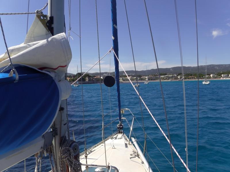 Idem pour moi la boule de mouillage est frappée sur la drisse de spi et une garcettte revient sur un des 2 taquets d'amarrage AV. Je peux régler la hauteur de la boule comme je veux. Et surement comme beaucoup de monde je remarque qu'elle tourne sur elle même pratiquement sans arrêt ce qui ne gêne rien. |