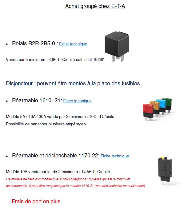 Bonjour à tous, Suite à la demande, j'ai donc consulté ETA. Ci joint les références qui pourraient être commandées. Il y a des minimums de quantité je ne pourrai donc passer qu'une seule commande. Je passe la commande d'ici une semaine, si vous êtes intéressés merci de m'envoyer un MP. Lien pour les fiches techniques: • Relais R2R-2B5-0 : Fiche technique • Disjoncteur réarmable 1610- 21: Fiche technique • Disjoncteur réarmable et déclenchable 1170-22: Fiche technique