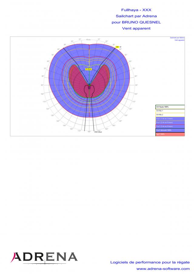C'est exact. J'ai moi même fait la promotion de cet outil dans d'autres fils. Mais ce n'est quand même pas à la portée de tout le monde. Cela nécessite que le bateau ait un PC à bord actif en navigation et connecté à plusieurs capteurs qui envoient les infos collectées. Le skipper doit aussi renseigner de nombreux paramètres comme le type de voile en place et les conditions de mer au moment des mesures. J'ajoute que pour obtenir une polaire complète il faut de TRES nombreuses navigations car il faut couvrir tous les cas de figure vent/angle/voile etc.... C'est la même chose avec ADRENA. Les skippers professionnels avec leurs équipes de technicien mettent des mois à bâtir les polaires des bateaux de course. Avons nous ce temps ???? Ipolar suffit largement pour le plaisancier lambda et cela prend 2mn pour avoir une polaire acceptable pour nos bateaux. Ensuite en faisant jouer le paramètre d'ajustement de la polaire en pourcentage on peut se corréler avec la réalité et faire l'ajustement utile. Et on arrive à un résultat suffisant proche de ADRENA Chacun fera comme il veut en fonction de ses possibilités d'installation et de son éventuelle addiction au GEEK. Geek je suis mais j'ai abandonné Polauto et même Adrena Pro. Aujourd'hui j'utilise essentiellement sur Ipad le logiciel W4D Navigation & Routing qui couvre tous mes besoins et reste utilisable par tout l'équipage. C'était loin d'être le cas d'ADRENA. Pour info une image de la polaire de mon bateau définie sur ADRENA SAILCHART