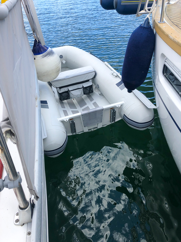 Le tableau arrière de l'annexe est percé débouchant. L'étanchéité est faite au SIKA ou autre mastic et cela ne pose aucun problème. Pour les cales vu que j'ai acheté les roues en cours de navigation j'ai fait avec ce que j'avais. En l'occurrence ce sont des lattes de teck de pont que j'avais en stock à bord que j'ai coupé et empilé les une sur les autres. On peut faire plus propre avec des cales en nylon par exemple. Mais j'ai laissé ça pour l'instant.