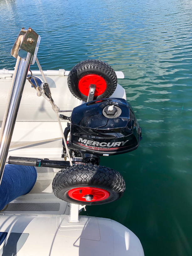 Pour palier le problème de rotation évoqué par Igloo lors des manoeuvres il m'arrive de laisser libre les roues une fois à l'eau. Comme elles sont gonflées elles flottent et sont à l'horizontal sur l'eau. Plus de problème pour tourner à 360° le moteur. La pose et dépose est aussi très simple. Une goupille et 2 clips sur ressort. Pour rien au monde je reviendrais à autre chose. Si le coté esthétique en navigation vous est insupportable vous pouvez les retirer avant de remonter l'annexe. Je ne le fais pas. Vous pouvez aussi peindre les roues d'origine en rouge vif par une couleur plus discrète (gris ou noir)