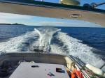 ce n'est pas mon bateau juste un exemple avec un bateau equipé d'un seul moteur essenceje disais donc, en terme de consommation totale en comptant les 2 moteurs. a 1000 tr/mn, je tourne a 6 nds et 15l/h, a 2000 tr/mn, le bateau a déjaugé et je suis a 17 nds et je consomme 20l/h, a 3100 tr/mn je suis a 32 nds pour 40l/h, ensuite la consommation s'envole, je suis a 60l a pleine vitesse pour 55nds, avec un réservoir de 520l de gas-oil ça offre une belle autonomie.