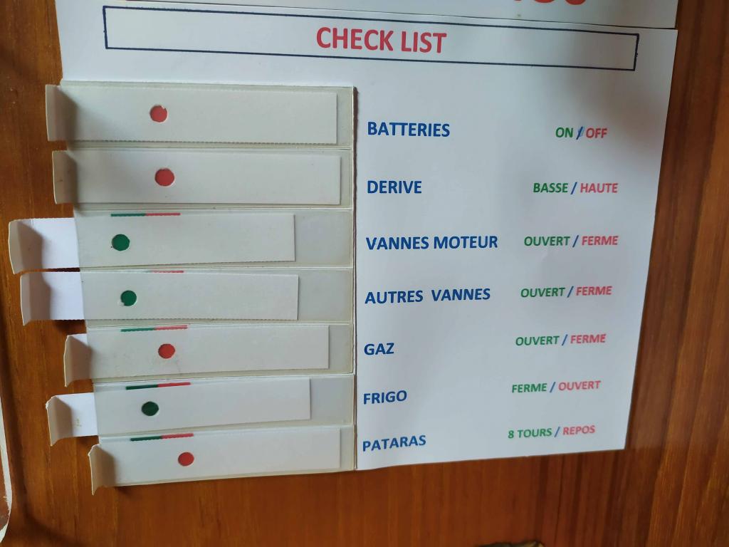 | Bonsoir , pourrais tu nous envoyer une photo de ton tableau ? En aéronautique , les pilotes ont des check up long comme un jour sans pain . perso je m'étais fait une liste check up pour le départ du port , surtout après vu un bateau quitter son catway sans débrancher la prise de courant ...