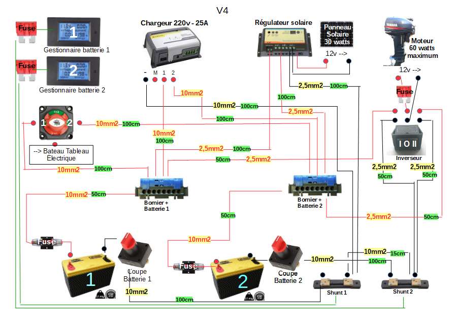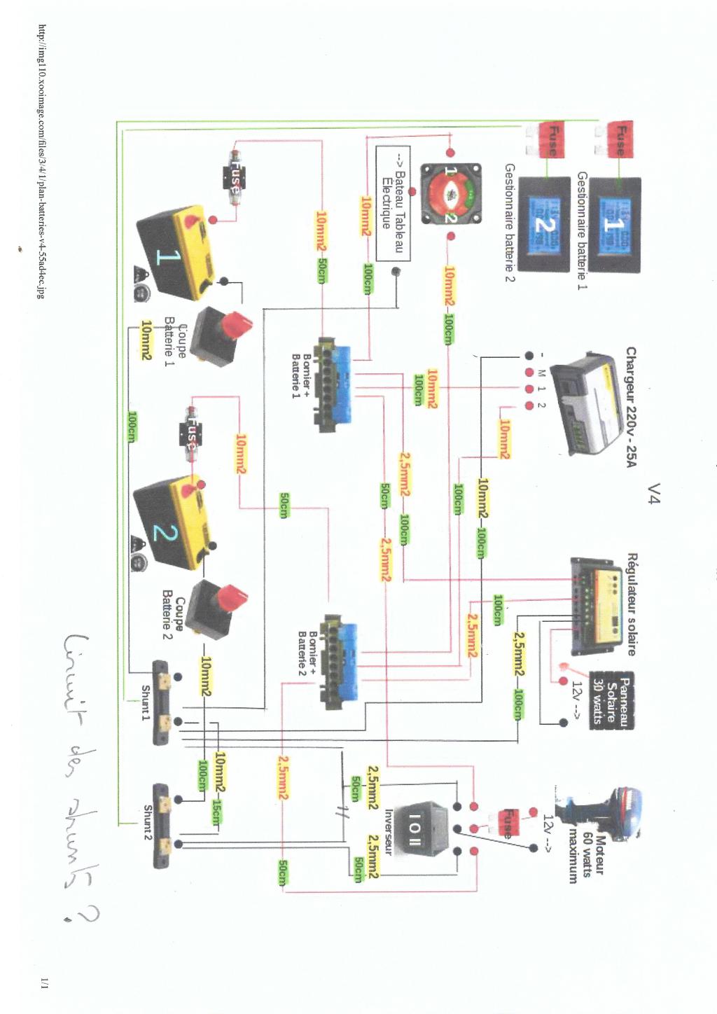 Derrière les deux circuits - des batteries, les Shunts sont raccordés au - du tableau général. Cela va de soit bien qu'aucune représentation du tableau général ne soit indiquée. C'est vrai que cela perturbe un peu. J'aurais fait beaucoup plus simple. Mais je me suis déjà entretenu avec Tosamdy sur ce sujet. Il a fait son choix.
