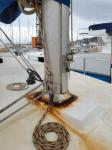 La plaque très corrodée semble vissée sur le pont, à vérifier si ces fixations traversent et si elles se reprennent sur une épontille ou vers une cloison.Ce serait bête d'arracher le pont en levant le mat, la grue est très puissante !!