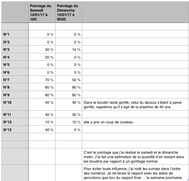 Pour vous faire patienter, voici un tableau récapitulatif de l'état des survies. Les premières ont été percutées le jeudi après midi, les dernières le vendredi matin.