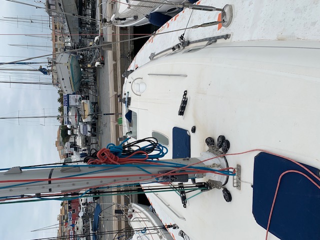 Ensuite comme tout le monde il y a le nettoyage int et ext, le déjaunissement au sel d'oseille de l'étrave, le polish de la coque, la cire de la coque, le rafraichissement de carène pour un rendu miroir, l'antifouling en 2.5 couches, le contrôle du safran et ses retouches éventuelles à faire à l'époxy, l'entretien de l'hélice, du moteur, le contrôle des vannes et passes coques, le contrôle des pompes diverses, le rinçage des manoeuvres, la dépose et le graissage - huilage des winchs, le huilage des coinceurs, le nettoyage du teck au sel d'oseille, la dépose pour lavage des coussins cabines et carré, la mise en entretien chez le sellier de cagnard, lazy bag et capote après lavage chez un spécialiste, la dépose et contrôle des voiles, le remplacement du bout du frein de bome, le réglage du jeu au safran, le remplacement de l'OTOFAX dont un fil s'était détaché et mis en court circuit, le contrôle du gréement, le graissage - huilage de l'enrouleur, le remplacement de quelques poulies, l'ajout de manoeuvres nouvelles de contrôle des voiles...... Vous en voulez encore ???