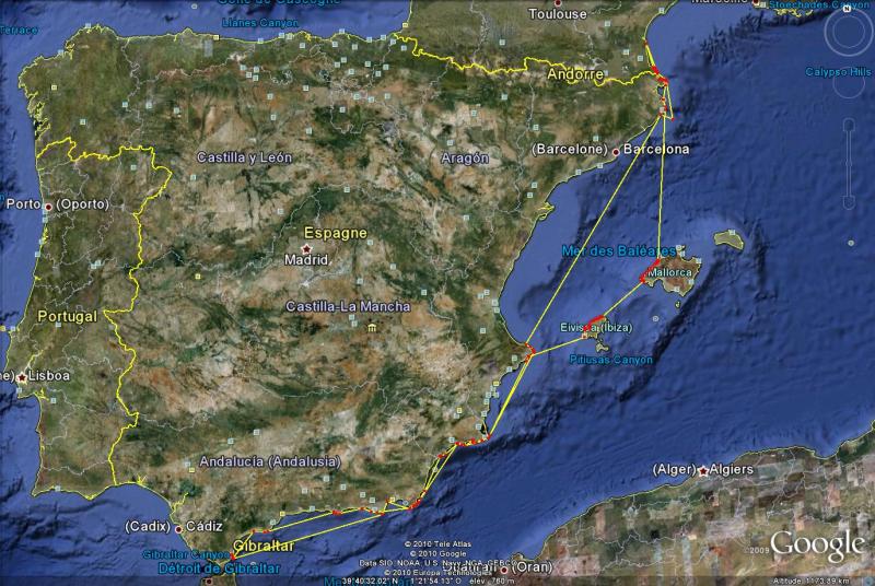 Joli parcours .Les Baléares c'était à l'aller ou au retour ? Pour juillet-août 2014, nous envisageons un circuit: Golfe de Fos Côte Varoise Corse Baléares Costa Brava nord Port Leucate Peut-être pourrons-nous nous rencontrer ? Amitiés |