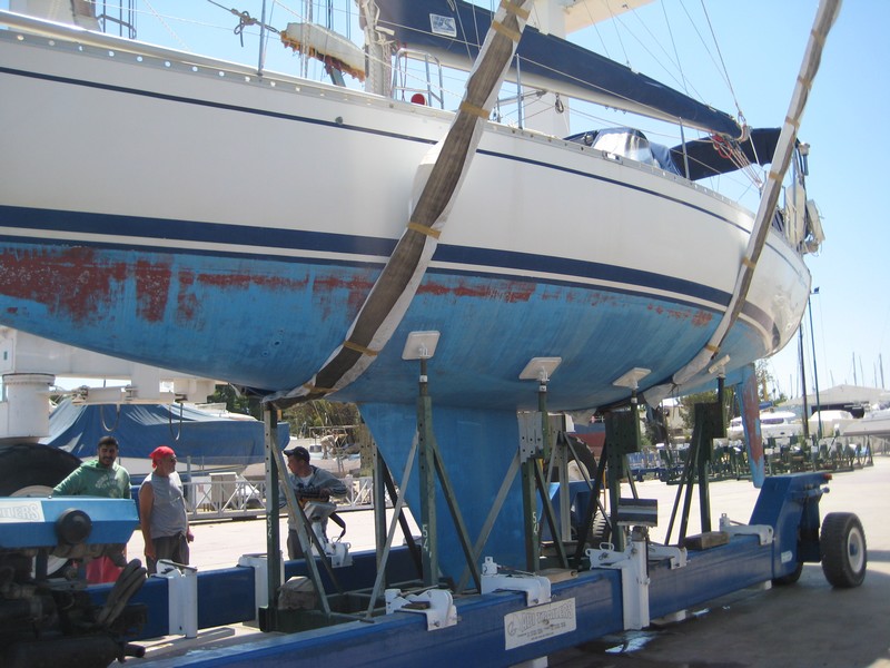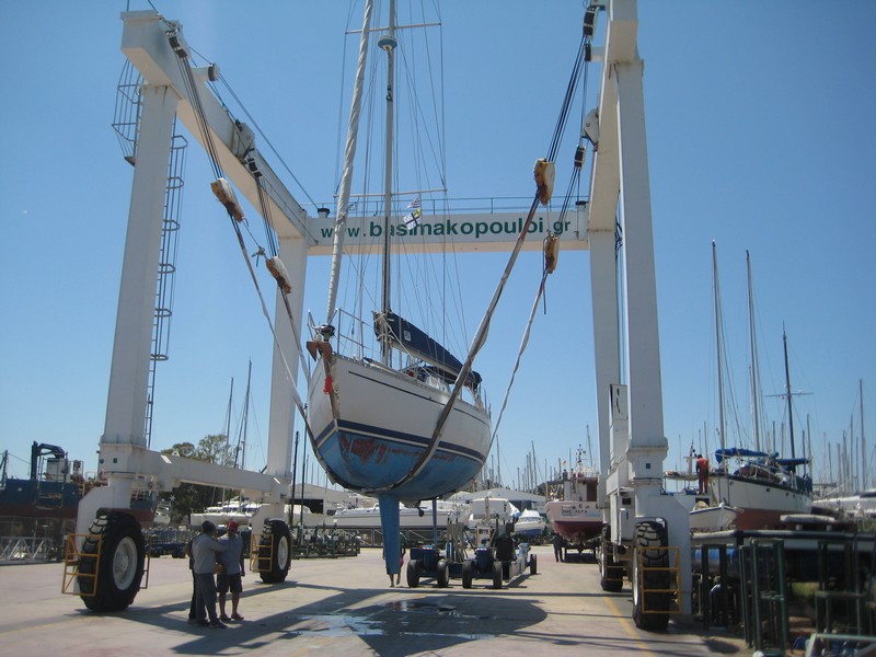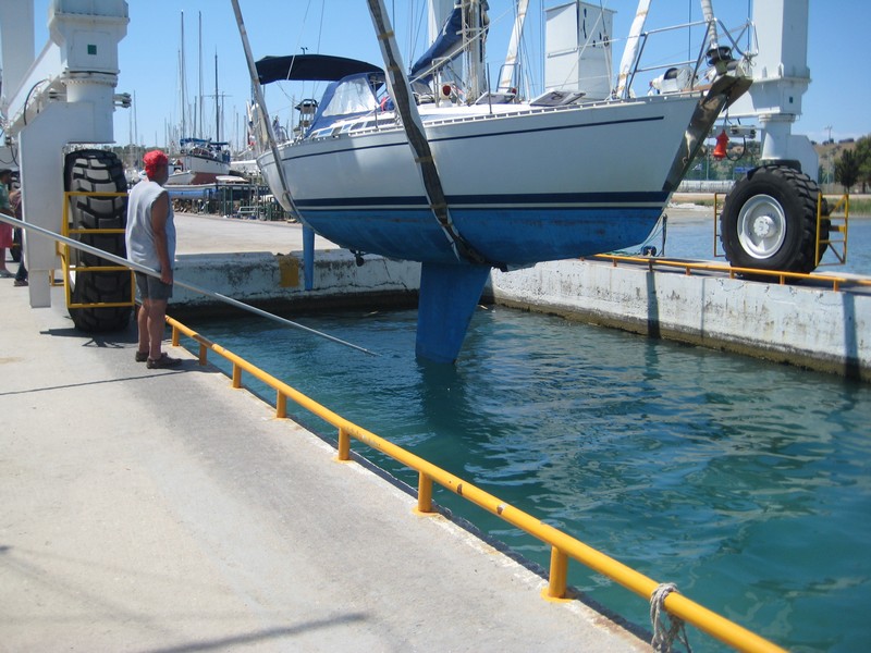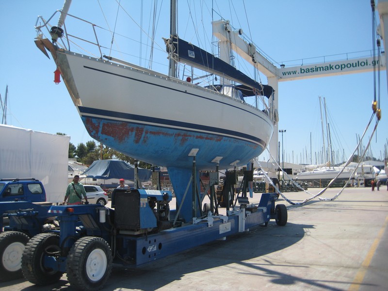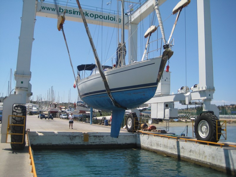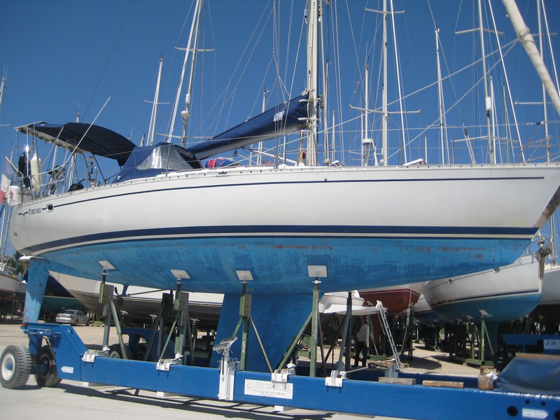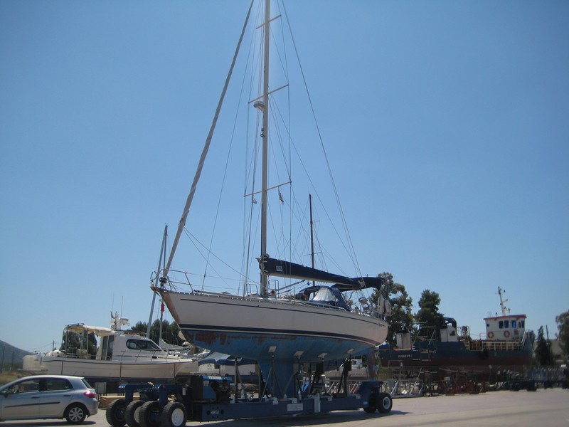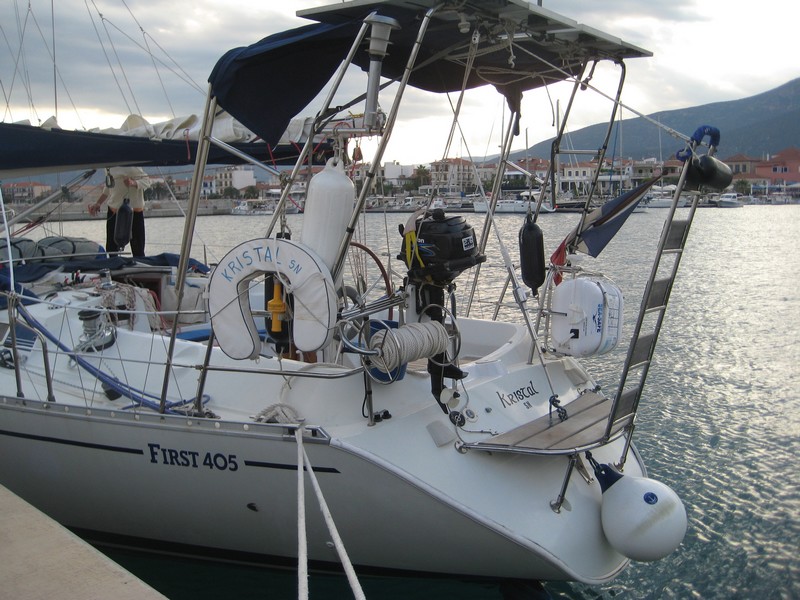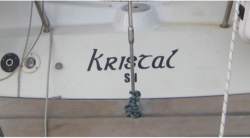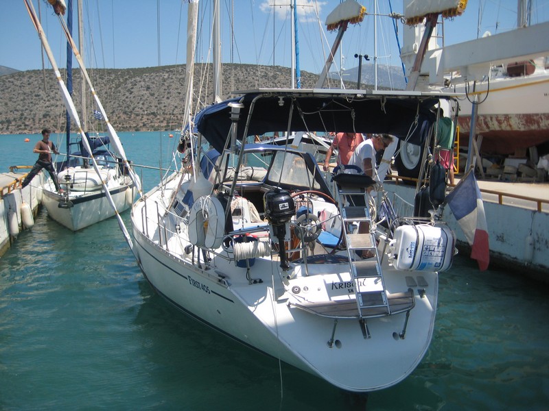 J'ai donc pris l'avion le 5 mai pour rejoindre Kilada en Grèce où était hiverné le bateau et où il a passé quasiment toute sa "carrière", y compris avec le premier propriétaire stationné en Turquie. Pour la petite histoire Kristal aura eu en tout 4 propriétaires. Le premier était le patron de chez Bénéteau de l'époque qui s'en était "servi" comme bateau de démonstration. Autant dire que déjà l'équipement était conséquent. Une vitrine ! Il s'appelait alors Quo Vadis. Puis il est passé dans les mains d'un deuxième qui l'a gardé pratiquement 20 ans. Eh oui !! Kristal a 30 ans cette année (en décembre). Le deuxième propriétaire méticuleux et surtout fan d'équipements et de matériels divers l'a quasiment équipé pour en faire une bête de régate et, par ailleurs en a fait quelques unes avec le bateau qui a pris le nom qu'il a eu jusqu'à ce que je le change : Kotaya II. Pourquoi avoir changé le nom ? Pour me l'approprier bien évidemment et surtout parce que tant que je ne savais pas à quoi le nom correspondait, je le trouvais sympa, jusqu'à que l'ex-proprio me le traduise et là........ En fait Kotaya est un mot d'une langue africaine qui veut dire "gros ventre", mais d'une femme enceinte. Évidemment ça ne correspond en rien à mon histoire, donc changement !