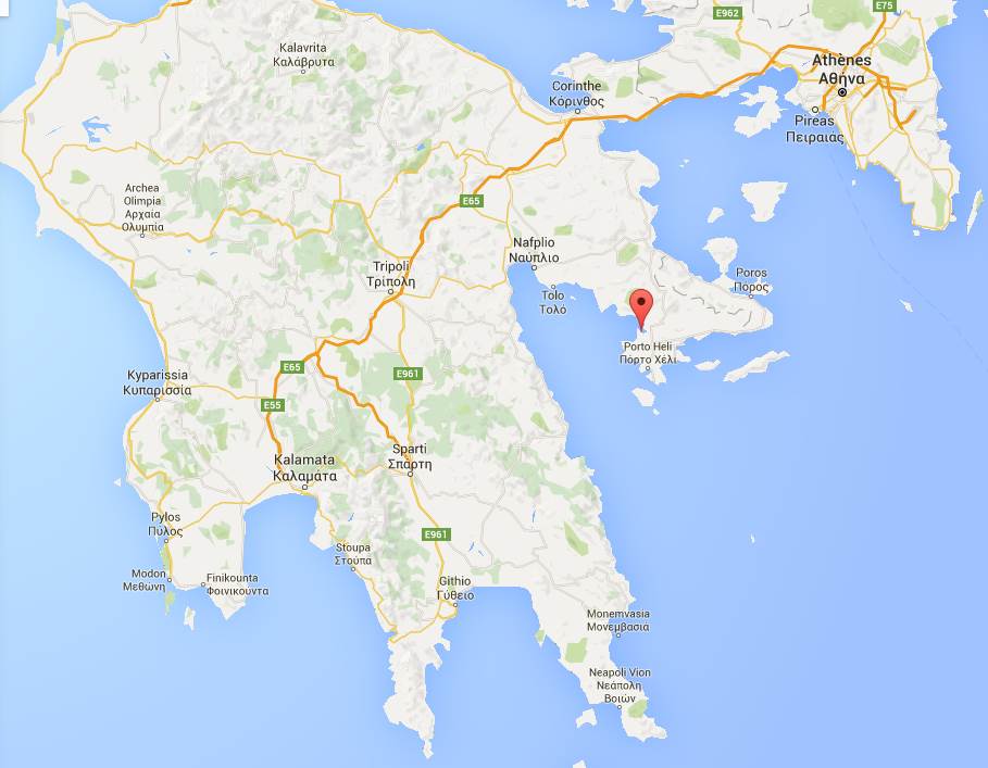 Kilada est un tout petit port qui se situe grosso modo à 2 heures d'Athènes en voiture. Après une partie sur autoroute, la deuxième moitié du parcours traverse les montagnes et est une succession de virages à flanc de montagne.