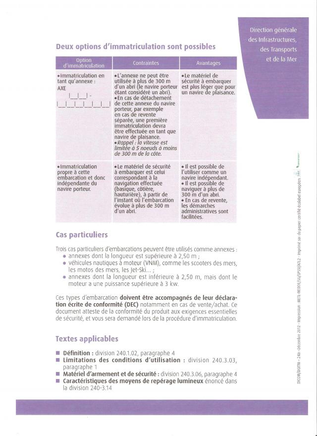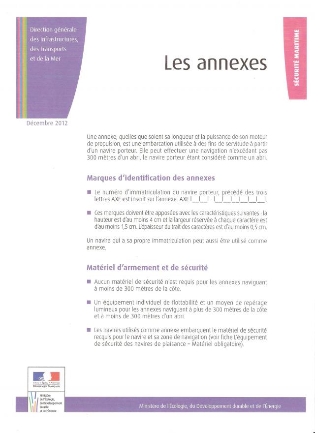 Pour ce qui est des annexes, on est retombé sur un débile haut fonctionnaire qui navigue entre son bureau, les ors de la république et sa limousine. Encore un règlement idiot, paralysant, liberticide et dangereux. Mais qui peut payer : (TVA, amendes etc). Le matériel de sécurité, l'immat, les 300 + 300 mètres, interdit la nuit. Stupide. Quand la même administration décide que la nuit administrative commence à 17 h l'hiver à cause du changement d'heure...On y va à la nage, c’est plus sûr ??