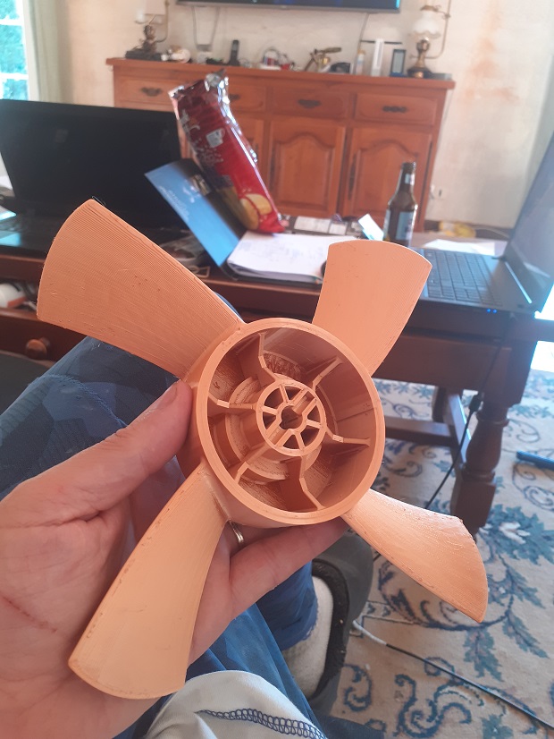 voila, hélice terminée. je l'ai fait avec un fond de bobine de PLA 4 pales avec un pas plus faible. essai ce week-end avec mes petits enfants. (si il ne fait pas trop chaud.)