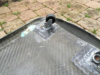 En dessous les roues pivotantes sont une hérésie, si le bateau bouge quand vous montez à bord, les roues se tournent et c'est la passerelle qui râcle. Je vais les remplacer par un tube carbone avec un axe à l'intérieur et deux roues latérales totalement en téflon.