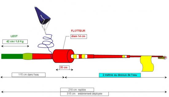 L'assemblage : décaper la peinture sur la canne pour découvrir le tissu de verre aux endroits des extrémités du flotteur (son centre de gravité est à 1 mètre du bas de la perche). Fixer le flotteur à la canne à l'aide de bandelettes de tissu de verre et de résine,aux deux extrémités (en profiter pour fixer la cordelette de l'ancre flottante à l'extrémité inférieure et bloquer à la résine. J'ai également fixé le pavillon à la résine epoxy, à l'extrémité du dernier scion, juste sous la lampe flash.