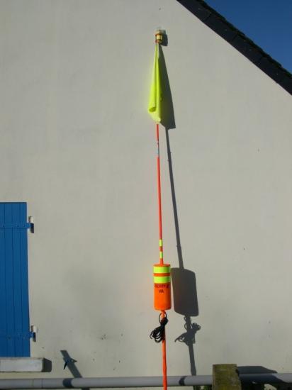 Finition : la lampe flash est fixée avec 2 colliers rilsan, protégés par du ruban adhésif. Un coup de peinture fluo orange , une ou deux bandes adhésives jaune (ou réfléchissantes)pour terminer. Je le fixe sur le portique arrière par deux clips plastique. En cas d'homme à la mer, elle est rapidement envoyée à l'eau.