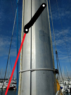 Voila, il s'agit de l'étai volant : autant le système de tirant entre l'étrave et le pont lui semble satisfaisant, autant le système de tension lui pose question par manque d'efficacité. J'avais en effet prévu un crochet pélican à levier